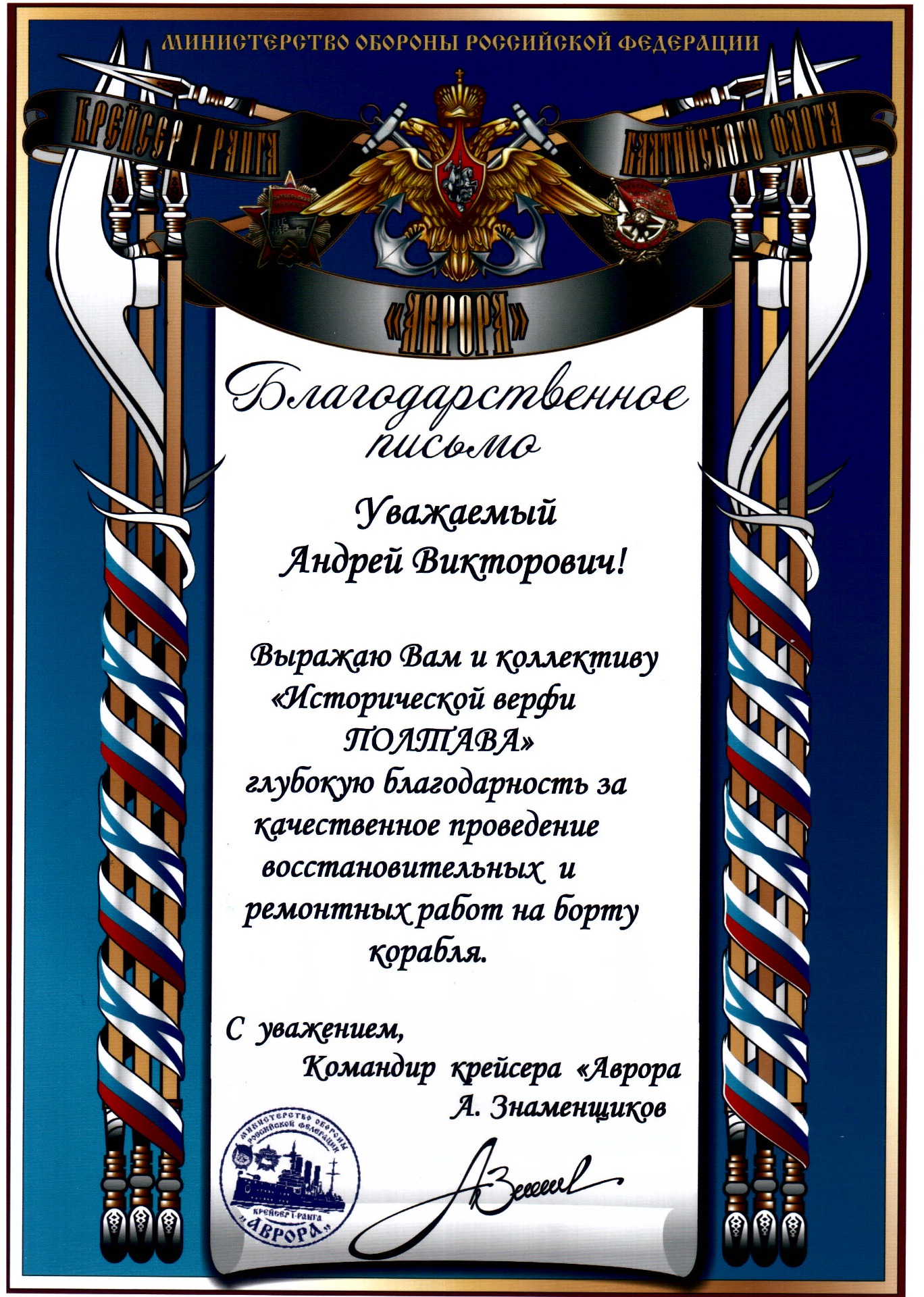Специалистами Исторической верфи «Полтава» проведены уникальные работы по реставрации и ремонту тикового настила палуб крейсера «Аврора», реставрации 2-х шестивесельных вельботов, 2-х двенадцативесельных катеров, 2-х шестнадцативесельных баркасов. Мастерами верфи были изготовлены новые киль-блоки, грузовая стрела и блоки шлюпочных талей. В парусной мастерской верфи изготовлены новые шлюпочные чехлы и обвесы коечных сеток.