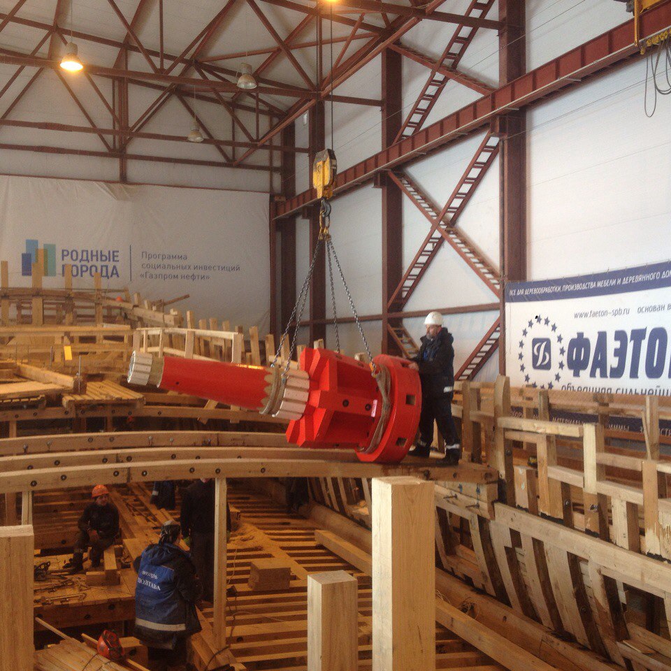 Установка якорного шпиля (механизм для подъёма якоря) на орудийную палубу гон-дек. Деталь весит 1100 кг. С помощью этого устройства на корабле выбирают якорный канат.